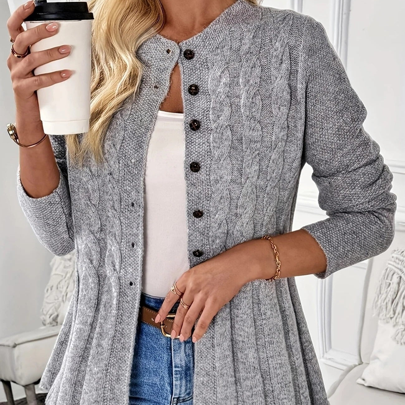 Diese geflochtene Strickjacke bringt Wärme und Stil in jedes Outfit. Ihr klassisches, feminines Design macht sie zu einem vielseitigen Kleidungsstück für kühlere Tage, ohne dabei an Eleganz einzubüßen.