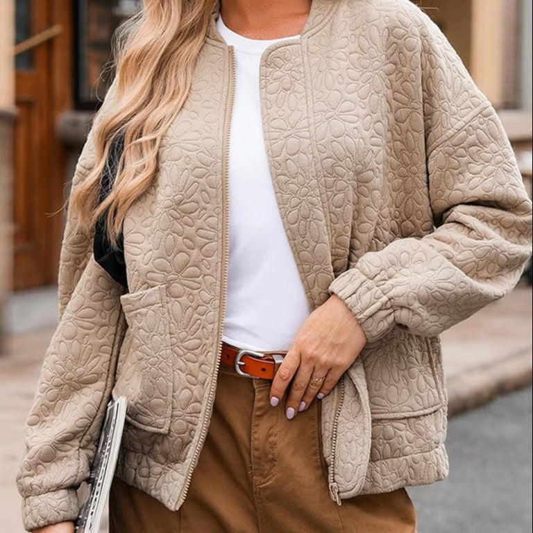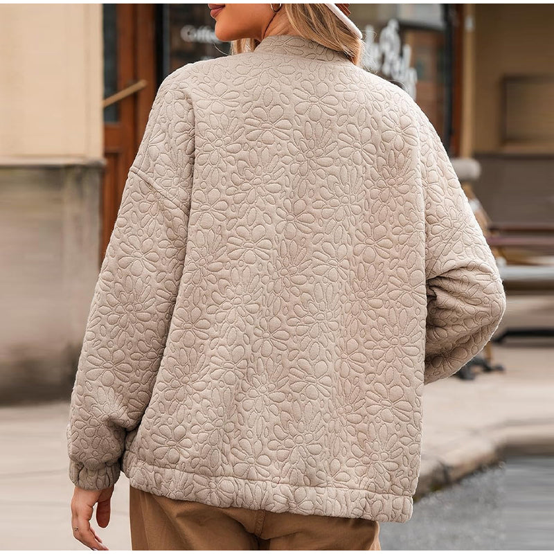 Diese Steppjacke kombiniert Komfort und modernes Design, ideal für kühle Herbsttage. Die geprägte, florale Struktur verleiht ihr einen unverwechselbaren, femininen Touch, während die lockere Passform für Bewegungsfreiheit und einen entspannten Sitz sorgt.