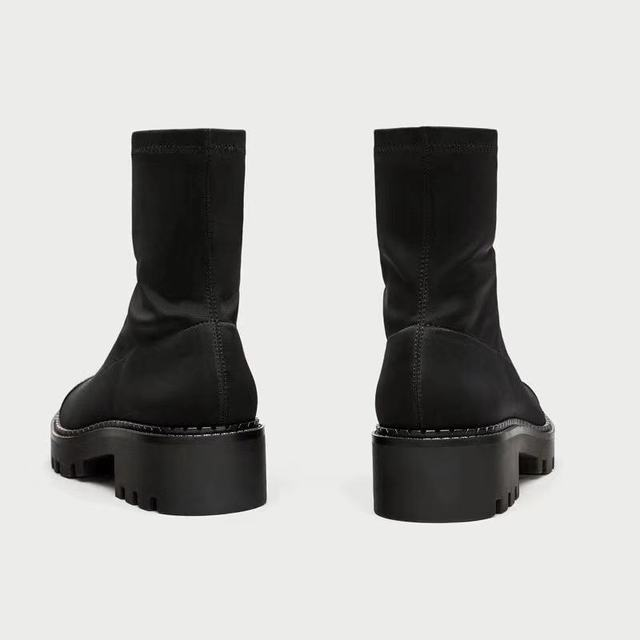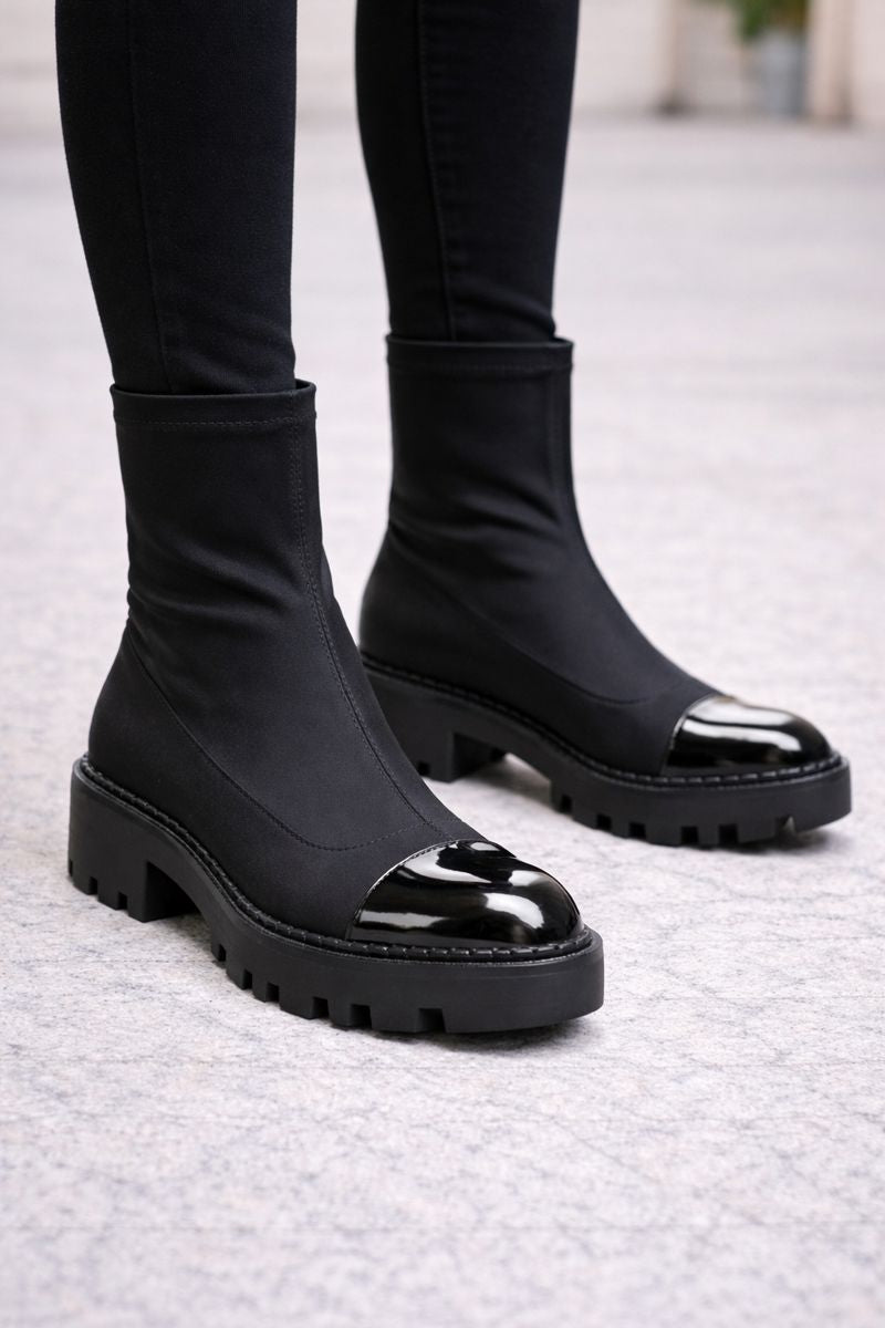Das Design kombiniert einen elastischen, knöchelhohen Schaft mit einem soliden Plateausockel. Die Struktur umhüllt den Fuß mit klaren Linien und diskreten Verstärkungen und sorgt für Stabilität und Halt bei kontinuierlichem Tragen. Die hochgezogene Sohle verfügt über eine ausgeprägte Traktion und ein funktionelles Profil, das für das Gehen in der Stadt entwickelt wurde.