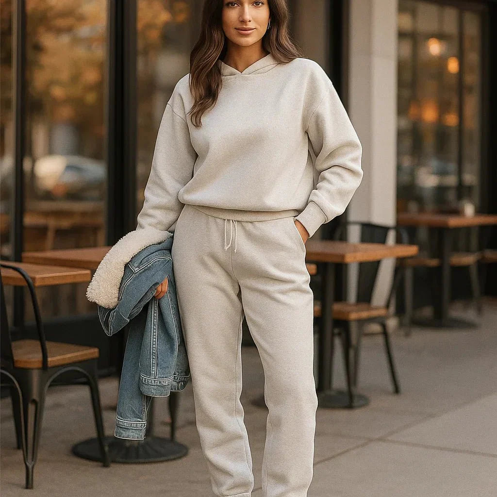 Dieses Ensemble vermittelt ein Gefühl von entspanntem Komfort, der gut zu Tagen passt, an denen Sie es einfach halten wollen, ohne an Präsenz zu verlieren. Das locker sitzende Sweatshirt und die Jogginghose sind aus einem weichen Stoff, der warm hält, ohne zu beschweren - ideal für die Herbst- und Winterroutine. Die Silhouette ist klar und ausgewogen gehalten und sorgt für einen eleganten Look auch bei legeren Anlässen.