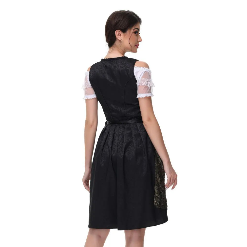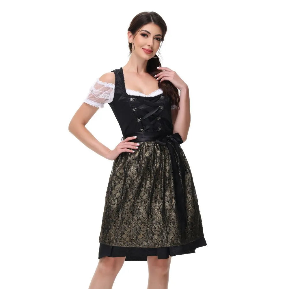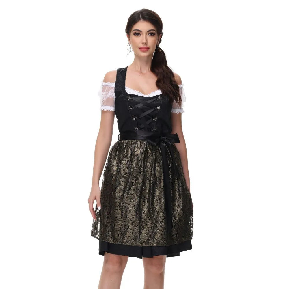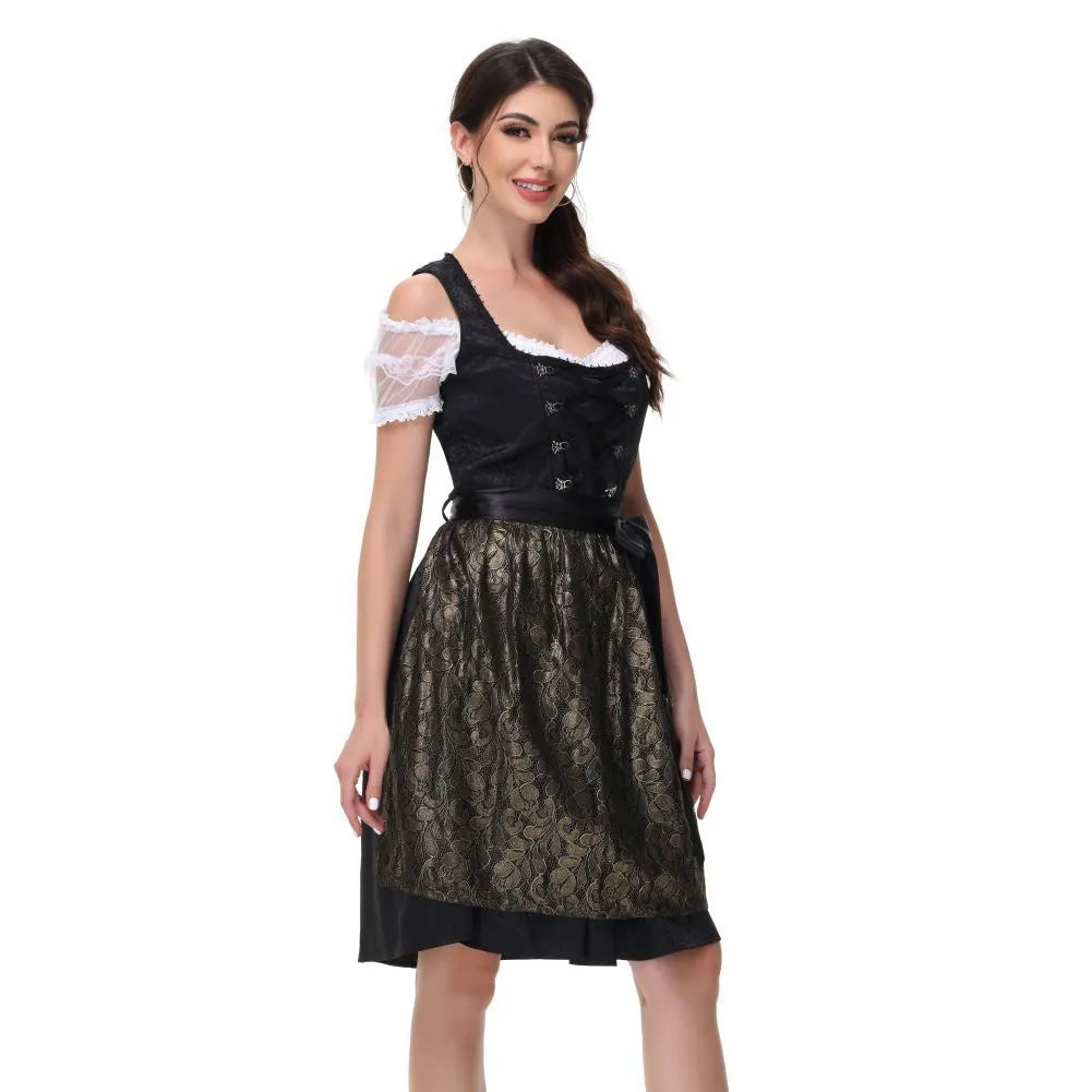 Dieses edle Dirndlkleid in Schwarz-Gold kombiniert bayerische Tradition mit stilvoller Raffinesse. Die glänzend bestickte Schürze und die klassische Miederschnürung verleihen dem Outfit einen festlichen und zugleich femininen Charakter – perfekt für das Oktoberfest, Galas oder Trachtenhochzeiten.