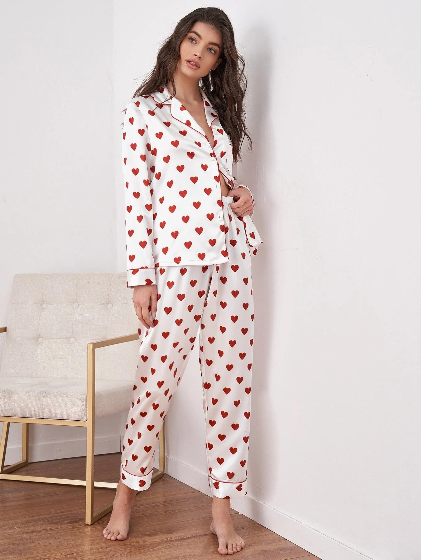 Dieses Pyjama-Set präsentiert sich als Zweiteiler, bestehend aus einem langärmeligen Hemd und einer geraden Hose. Das Hemd hat einen offenen Kragen mit weichen Aufschlägen, eine durchgehende Knopfleiste und eine integrierte Tasche. Der Herz-Print ist gleichmäßig auf beiden Teilen verteilt und sorgt für eine einheitliche und geordnete Optik.