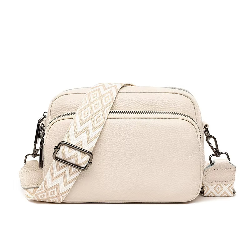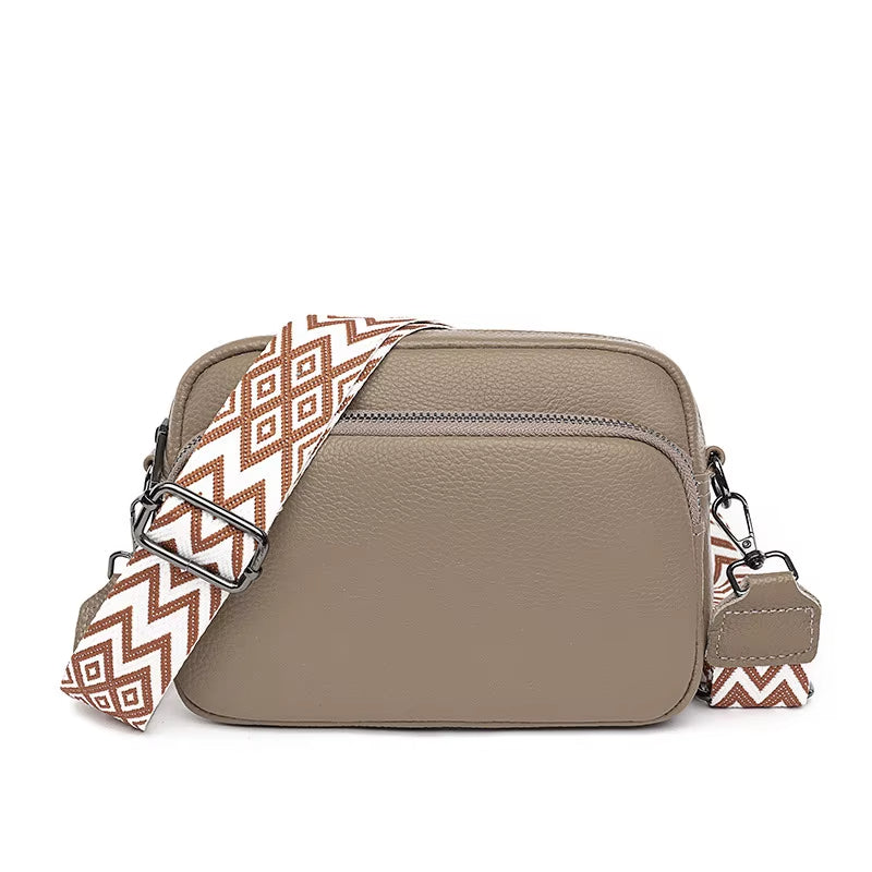 Diese Umhängetasche zeichnet sich durch ihr minimalistisches, quadratisches Design aus, das sanft strukturiert ist und durch einen verstellbaren Riemen mit geometrischem Print für einen böhmischen und raffinierten Look ergänzt wird. Die starre Struktur sorgt für eine hervorragende Organisation, während die Reißverschlussfächer einen schnellen und sicheren Zugriff auf Ihre persönlichen Gegenstände ermöglichen.