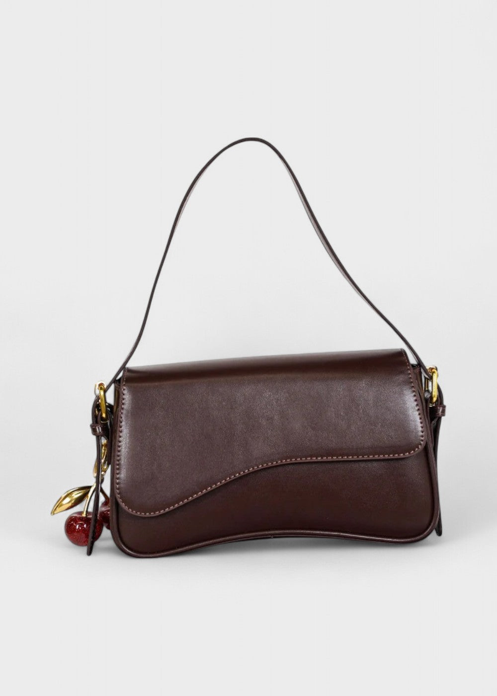 Diese Baguette-Tasche aus glattem, mattem Kunstleder hat eine strukturierte Silhouette mit einer geschwungenen Klappe und dezenten Metallbeschlägen. Dank des verstellbaren Riemens kann sie über der Schulter oder am Körper getragen werden und passt sich so mühelos Ihrem Stil an.