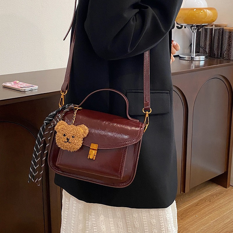 Diese Umhängetasche für Damen kombiniert ein strukturiertes Design mit einem charmanten Touch dank des weichen Teddybär-Anhängers und der dekorativen Bänder. Sie ist aus glänzendem Kunstleder gefertigt und bietet eine polierte, jugendliche Ästhetik, die sowohl zu lässigen Outfits als auch zu eleganteren Looks passt.