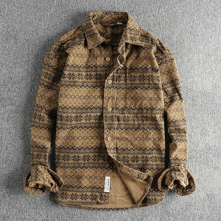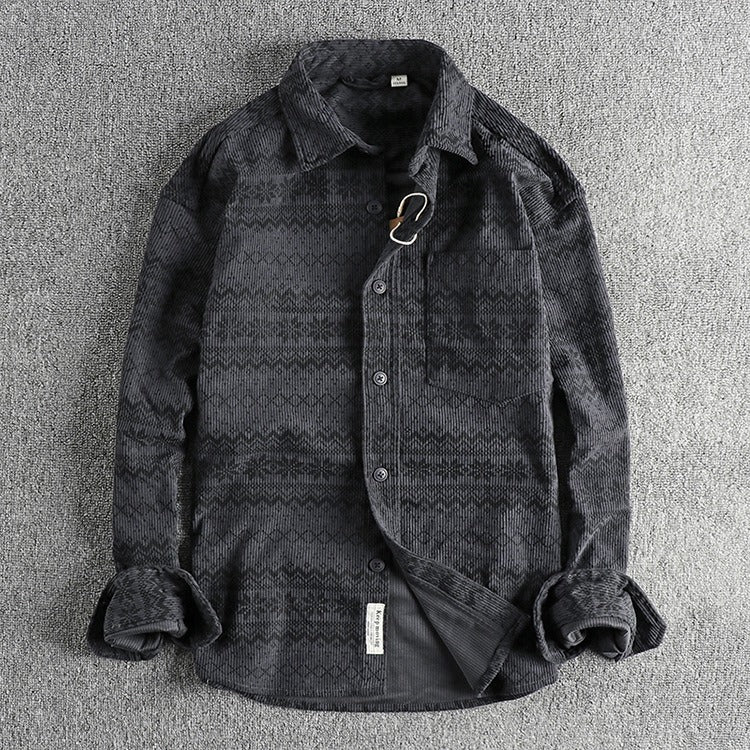 Ein charaktervolles Stück, das Authentizität und zeitlosen Stil vermittelt. Dieses langärmelige Herrenhemd ist aus weichem Cord gefertigt und mit einem ethnischen Print im Vintage-Stil versehen, der Charakter verleiht, ohne übertrieben zu wirken.