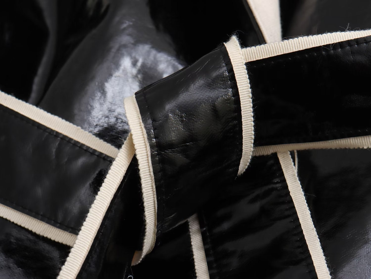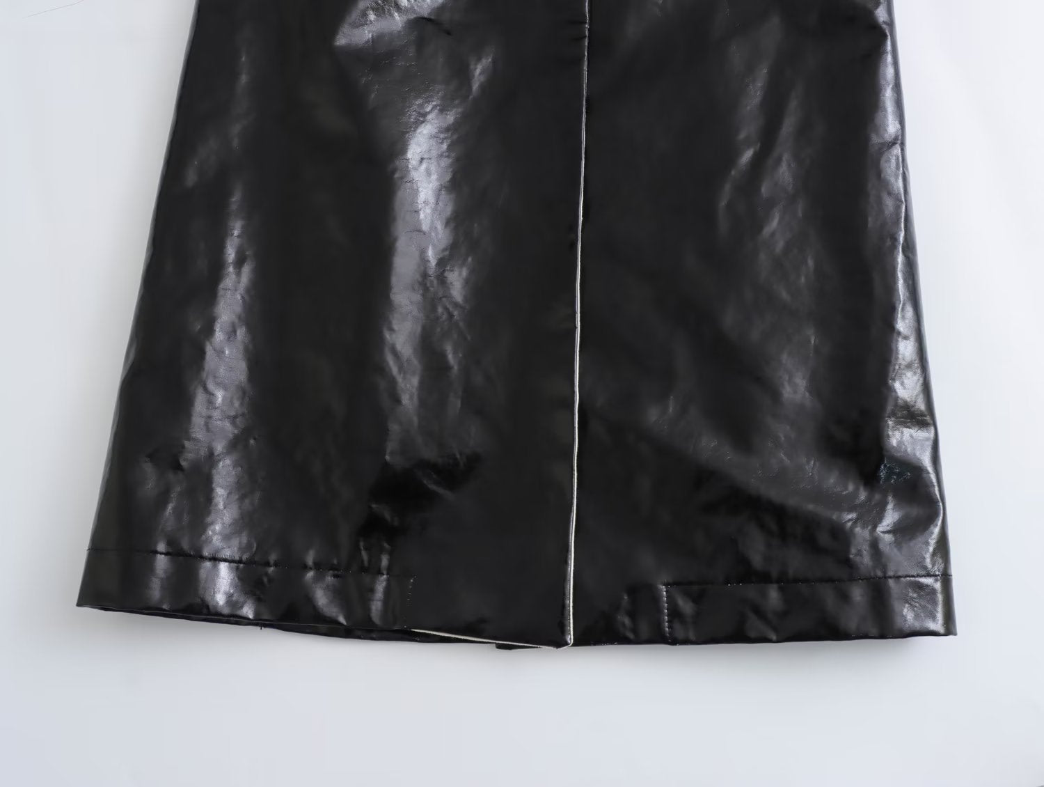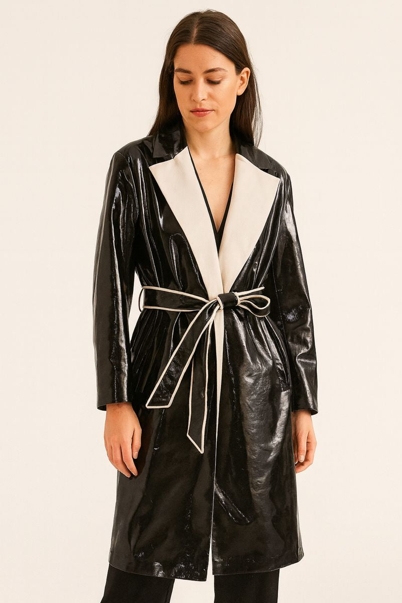 Dieser Mantel zeichnet sich durch eine langgezogene, fließende Silhouette aus, die für Präsenz sorgt, ohne steif zu wirken. Er wurde entworfen, um in der kalten Jahreszeit mit einem modernen Ansatz aufzufallen. Das breite Revers bildet einen strukturierten Rahmen im oberen Bereich, während die glänzende Oberfläche einen scharfen, eleganten optischen Kontrast bildet. Der Gürtel sorgt für einen körpernahen Sitz des Kleidungsstücks, moduliert die Form je nach gewünschtem Stil und bringt ein Gleichgewicht in das Ensemble.