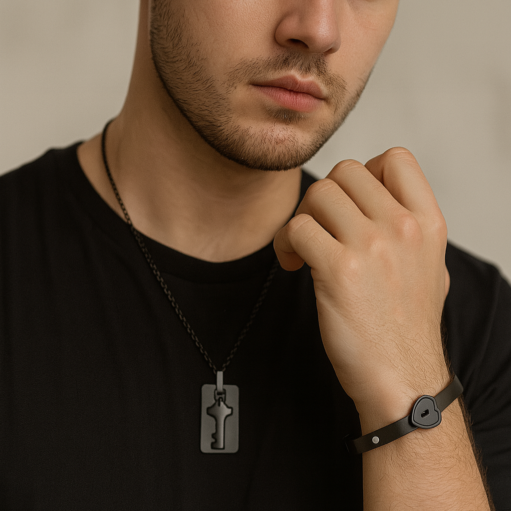 Das Set besteht aus einer männlichen Halskette mit rechteckiger Platte und Schlüsselanhänger sowie einem weiblichen Armband mit herzförmigem Verschluss. Beide sind aus einer mattschwarzen Stahllegierung gefertigt und verbinden modernen Stil mit symbolischer Eleganz. Die kleinen eingelegten Kristalle verleihen einen Hauch von dezentem Funkeln.